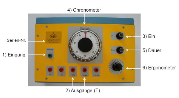 Option: Falls jemand das Chronometer-Ticken nicht hören will: Ohne Chronometer „Dauer“ drücken. Der Knopf „Ein“ entfällt dann. Dann muss die Anzahl Minuten der Anwendung selber gemessen werden (z.B. Stopp-Uhr, Wecker). Das Ergonometer (Drehknopf unten rechts – ist keine Uhr) eventuell einstellen als Memo für die Anzahl Minuten der Behandlung bei Funktion „Dauer“. Die Funktion wird erst beim Ausschalten unterbrochen (Knopf „Dauer“ auf aus).